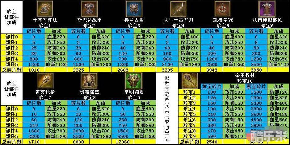 【珍宝各部件碎片需求及对应属性加成】