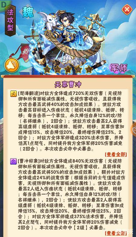 魏国玄金军师天禀曹冲,从小天赋异禀,有经天纬地之奇才。在战斗中,天禀曹冲可开启五级强控,在现阶段版本中,该控制可谓最强控场,可极大打压敌方的输出能力。同时,天禀曹冲还拥有永久减益机制,集中削弱了敌方伤害能力和行动力,从而达到掌控全局,克敌制胜的目的。