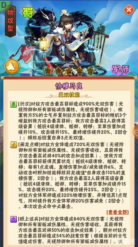 蜀国军师协穆马良与诸葛亮共佐蜀汉大业,作为玄金军师的他,拥有多重增益技能和士气回复能力。众所周知,战斗中的士气影响着军师的伤害/增益,协穆马良的高士气回复能力,可极大提升蜀国武将的伤害强度,从而使我方主力给敌方带来毁灭打击,碾压战场,势不可挡。