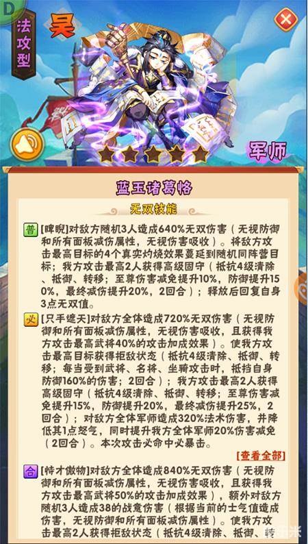 吴国玄金军师蓝玉诸葛恪乃三国名将、权臣,他首开了“火烧连营”机制,可随着回合数的推进将火烧蔓延,熔焰将越烧越旺。吴国火烧将愈旺,增益清除机制也将更加强势,如此优越的战力强度,可使蓝玉诸葛恪新版本中游刃有余,真正实现了星星之火可以燎原!