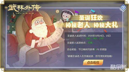 又是一年金钩拜~圣诞老人架着麋鹿雪橇,载着丰厚礼品来到了武林江湖。平安夜与圣诞节当天,圣诞老人将会随机在京城巡游!围观圣诞老人,即有可能收获圣诞礼物,节日期间每名玩家都有10次收获奖励的机会哦~