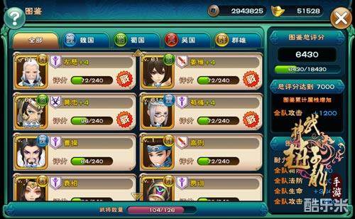 如何获得评分是关键,每获得一个新的武将都可以增加评分,每次提高武将星级可以再次增加评分,每升1星,可以增加20%评分。图鉴属性是达到指定的评分后能够增加的属性累计值,图鉴增加的属性均为全队增加,对所有上阵的武将均有效。