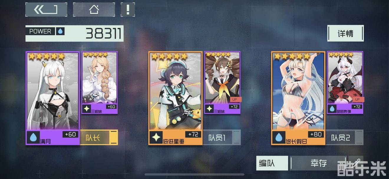 阵容,抄的白夜大神了,假日主力,另外两个算切换挂件吧。在战斗中切换人物是有大概2s无敌的无敌的,也就是幸存者打法的核心。
