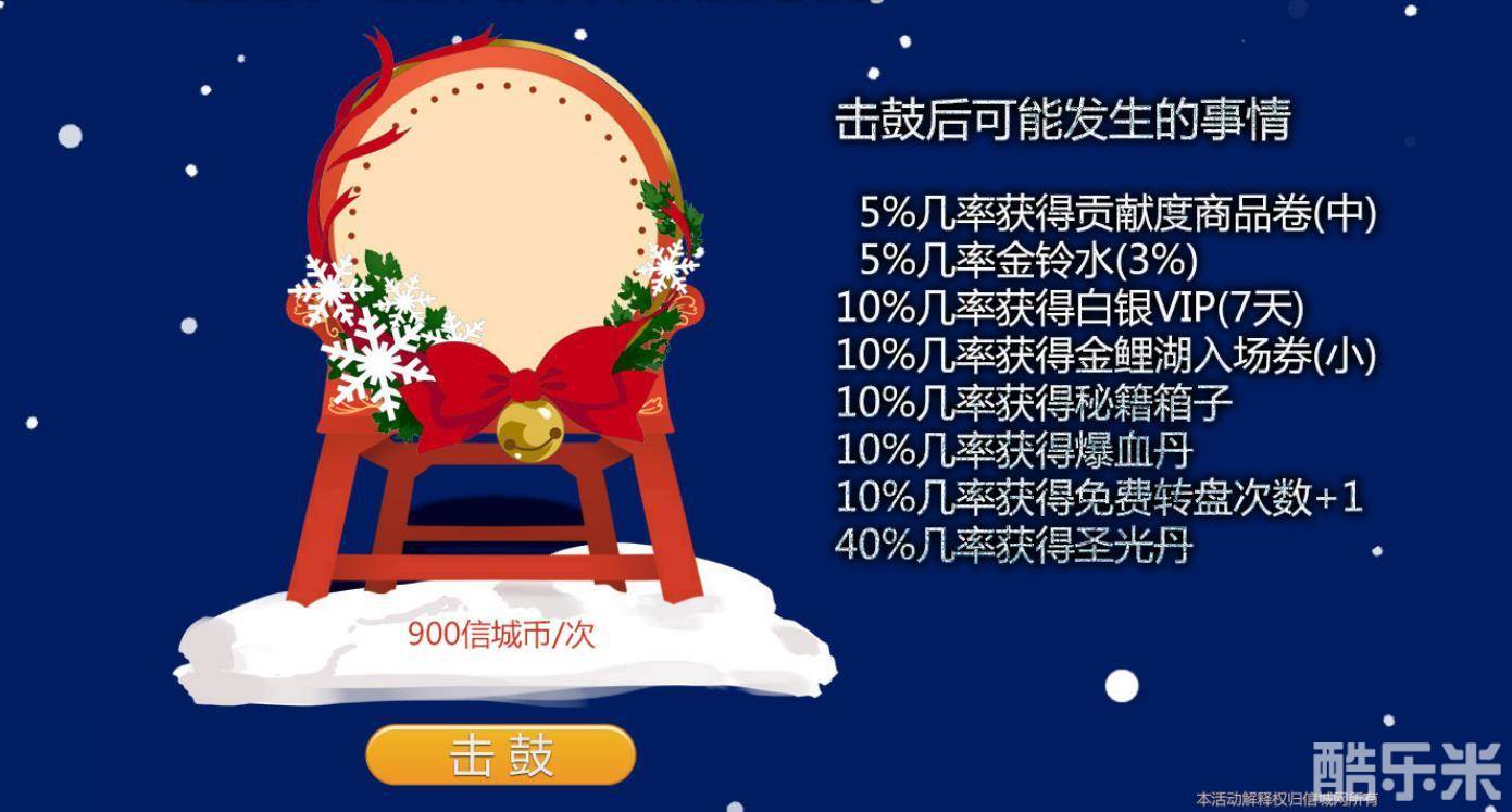 活动四:“诞旦鼓” 每次敲击“诞旦鼓”有几率获得各类物品,属攻丹、属防丹等奖励你来拿!击鼓更有几率获得免费转盘机会哦!