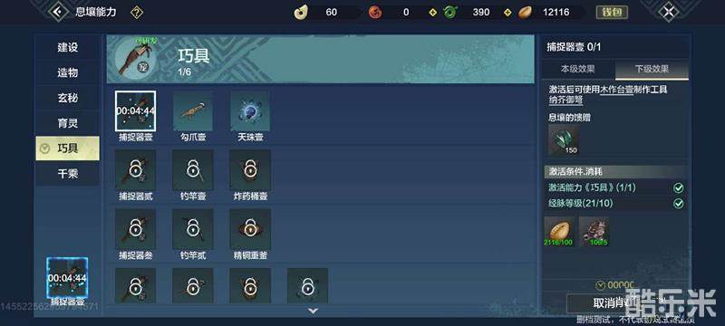 一、合成台制作:玩家在息壤中解锁【巧具】后就可以解锁里面的捕捉器科技了,解锁完成后就可以在木作台中将其制作出来了(科技越高的捕捉器捕捉的成功率就越高)