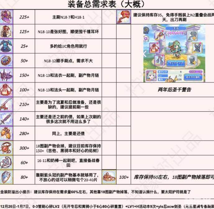 1月7-1月8日存体力,1月9日N2开始后主刷18-7、18-10、18-13,本期装备压力不大,6-9管多囤点千禧耳环。