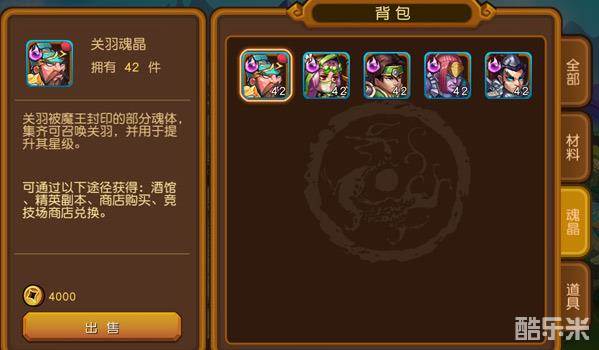 在背包的魂晶一栏中,我们可以看到玩家现在拥有的武将魂晶碎片。点击魂晶后可以选择出售,不过这是一件非常亏本的买卖哦。即使用不着,我们还是建议玩家放在包裹中,以备游戏后期的不时之需。