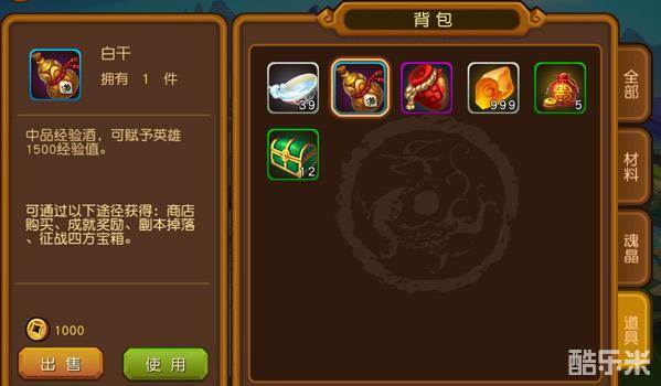道具中包括各种经验酒,强化石,钱袋,宝箱等等。玩家选取道具后,可以在左侧弹出的框中点击出售或者使用。