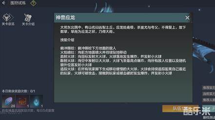 摆放好之后,有一个【入画】按钮,点击就能进入围狩图页面。在围狩图页面有四个等级不同的巨兽,分别是应龙,狌狌,萤皇和颙鸟。神兽强度随神兽开放等级提升,等级越高,奖励也越好。在页面左上角有关卡介绍,建议各位旅者进入前先看看技能介绍。