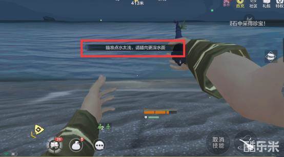 5、如果看到瞄准点水太浅的字样,请把你的视角往上调,看着远处的深水再将鱼竿抛出。