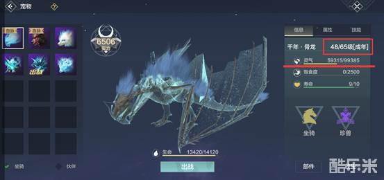 上图左边骨龙等级,左边是宠物当前等级,右边是宠物最高等级,也就是宠物灵气获取上限。目前还没有办法可以突破。