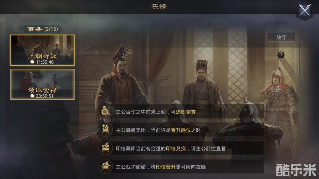 除了提升爵位等级外,功勋还可用于兑换战略资源、获取及晋升印信。在本赛季中,玩家会获得上朝听政陈情,在该陈情中主公们可以根据当前爵位进行述职领赏、消耗功勋提升爵位、兑换或晋升印信。如何分配和使用功勋,全凭主公们的决策。