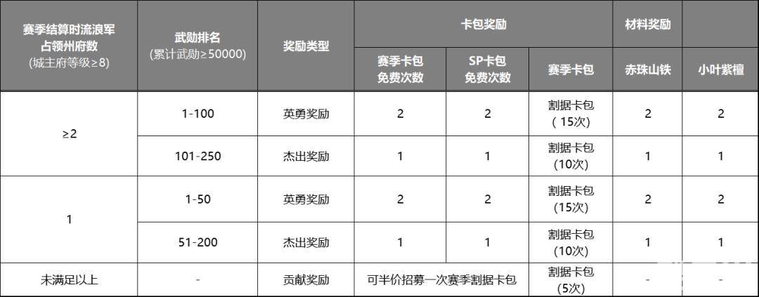 除流浪军以外,本赛季中所有势力间战斗将不产生武勋,由功勋替代。赛季荣誉的计算方式与其它赛季仍保持一致,仅计算功勋中原武勋的部分。