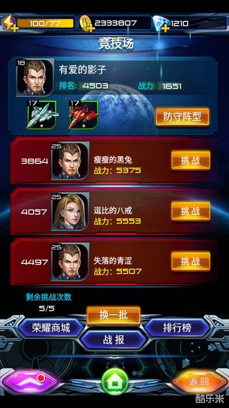 飞鹰战队》竞技场是玩家进行PK的地方,在这里你可以设置自己的防守阵型,也可以主动对别人进行挑战。每天可以挑战5次,挑战成功或者失败都能获得相应的荣耀币,荣耀币在荣耀商城可以获得子机碎片。