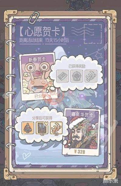 嘉年华贺卡:需328RMB购买,分享后可得邮箱皮肤—圣诞树,安西帝圣母碎片*40,鹿茸*20