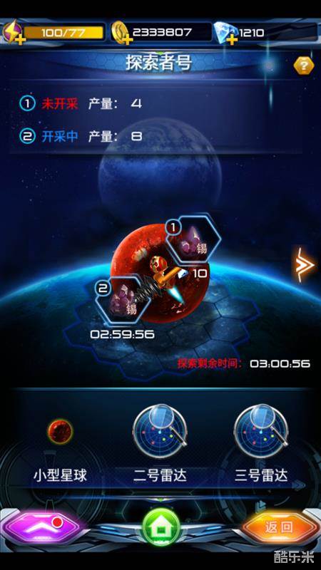 探索者号中使用战机进行探索,他根据你已经获得的战机开放可以探索的星球,开放的星球越多,获得的资源越多。而且可采取的矿产资源是根据战机的品阶来决定的。探索玩的战机需要8个小时冷却。探索者号中矿石的品质是锡/铝/铁/铜/银/金/钛。