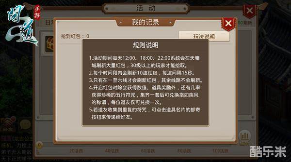 需要注意的是,只有大于30级的玩家才能拾取红包;在每波(1个时间段内有10波)100个的红包雨中,玩家只能拾取1个红包奖励,如果道友在本波中已经拾取了红包,那就等下一波红包雨来临之后再拾取吧。