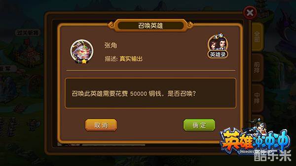 英雄根据自身站位,分为前排、中排和后排,各自发挥功用不同。当集齐英雄魂晶时,可以使用铜钱直接召唤英雄。