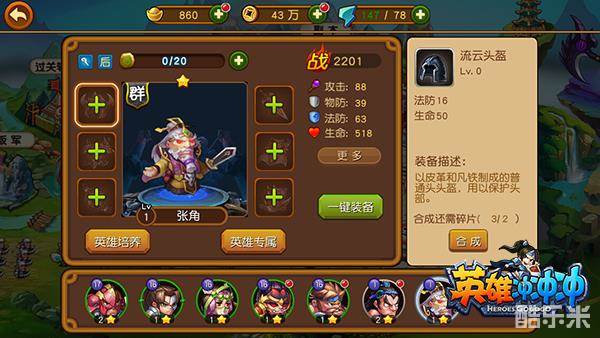点击英雄头像即可进入装备界面,每个英雄都拥有6个装备卡槽(分别为头盔、胸甲、兵符、剑、披风、靴子),右侧还显示有装备详细信息,玩家可以选择“一键装备”进行佩戴。需要提醒的是,装备一旦佩戴便无法卸下了,所以玩家必须针对性的选择培养英雄。
