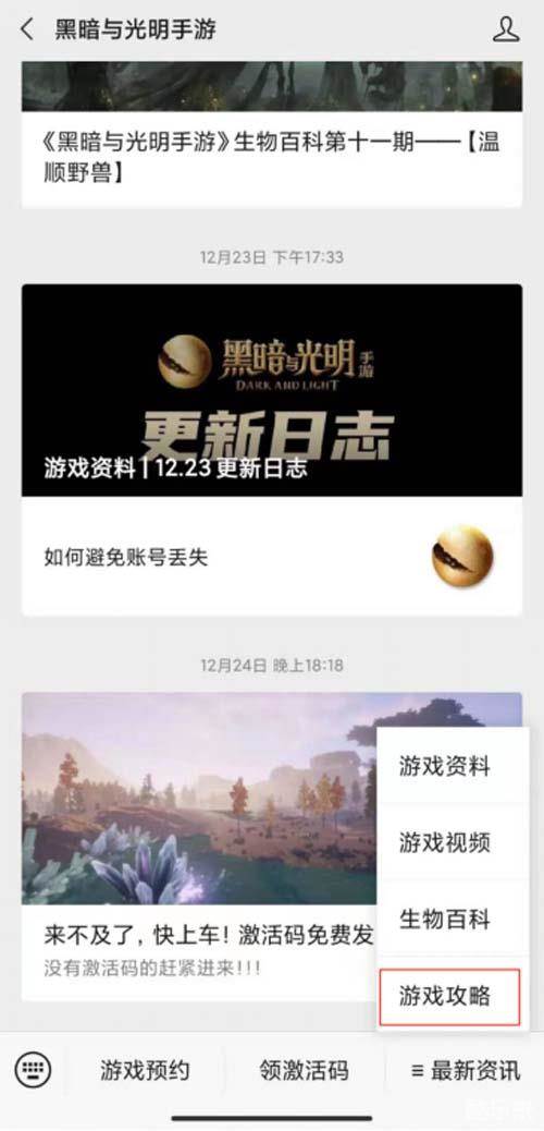 此外,对于玩家生存初期的几个常见难题,官方也给出了相应的入门攻略(详见官方微信公众号“黑暗与光明手游”,点击菜单栏“最新资讯”-“游戏攻略”即可查看)。