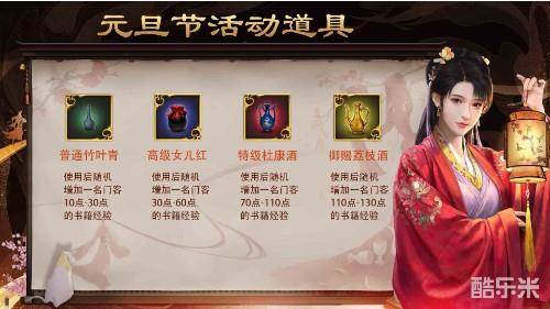 在跨年这个普天同庆的重要夜晚,能少了美酒的助兴呢。使用黄字贴、玄字帖、地字帖和天字贴道具,就能获得竹叶青、女儿红、杜康酒和荔枝酒四种美酒。让大人与门客红颜们彻夜长谈,不醉方休,同庆跨年夜。品尝四种不同的美酒,还能随机增加一名门客的书籍经验,帮助大人平步青云。