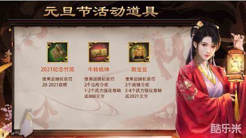使用2021纪念竹简,回忆自己过去一年的丰功伟绩,能随机获得20-2021政绩,为新年新事业讨个吉利的彩头。使用牛转钱坤和聚宝盆,召集祥瑞福兆,能随机获得出战令、追捕令、武力强化卷轴或者元宝道具。手握强力道具,又怎会怕升官遇阻呢?