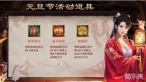 打开新年贺卡,上面满满的都是门客与红颜对大人的诚心祝福,还有88-168元宝随卡相赠,心意十足。使用金牛献瑞和摇钱树,还可以随机获得翡翠心、亲密香囊或者大量元宝。让大人在新年伊始便赚得盆满钵满,是未来官运亨通的好兆头。