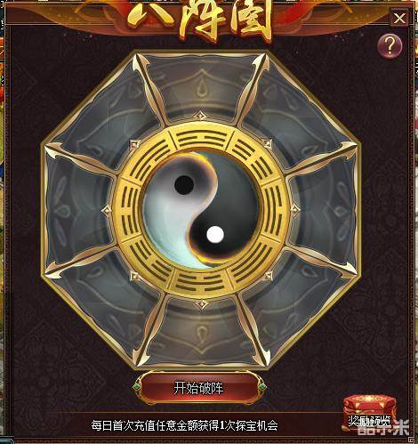 活动内容:活动期间,在游戏主界面上方“八阵图”按钮进入活动界面。每日充值都会有一次破阵的机会,破阵后可以获得对应的奖励。同一个阵位下的两个点都被激活,可以额外获得阵型的对应奖励。开启完16个后可以获得最终八阵图大奖。获得大奖后,隔日凌晨4点重置八阵图,可继续破阵。