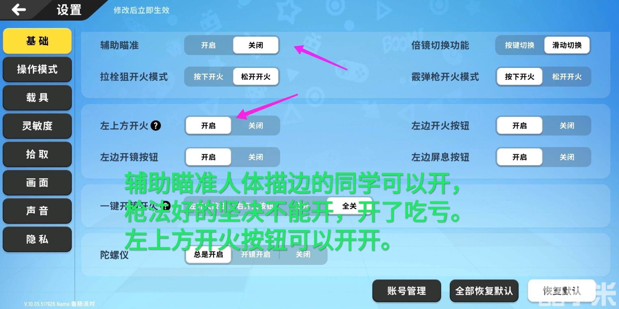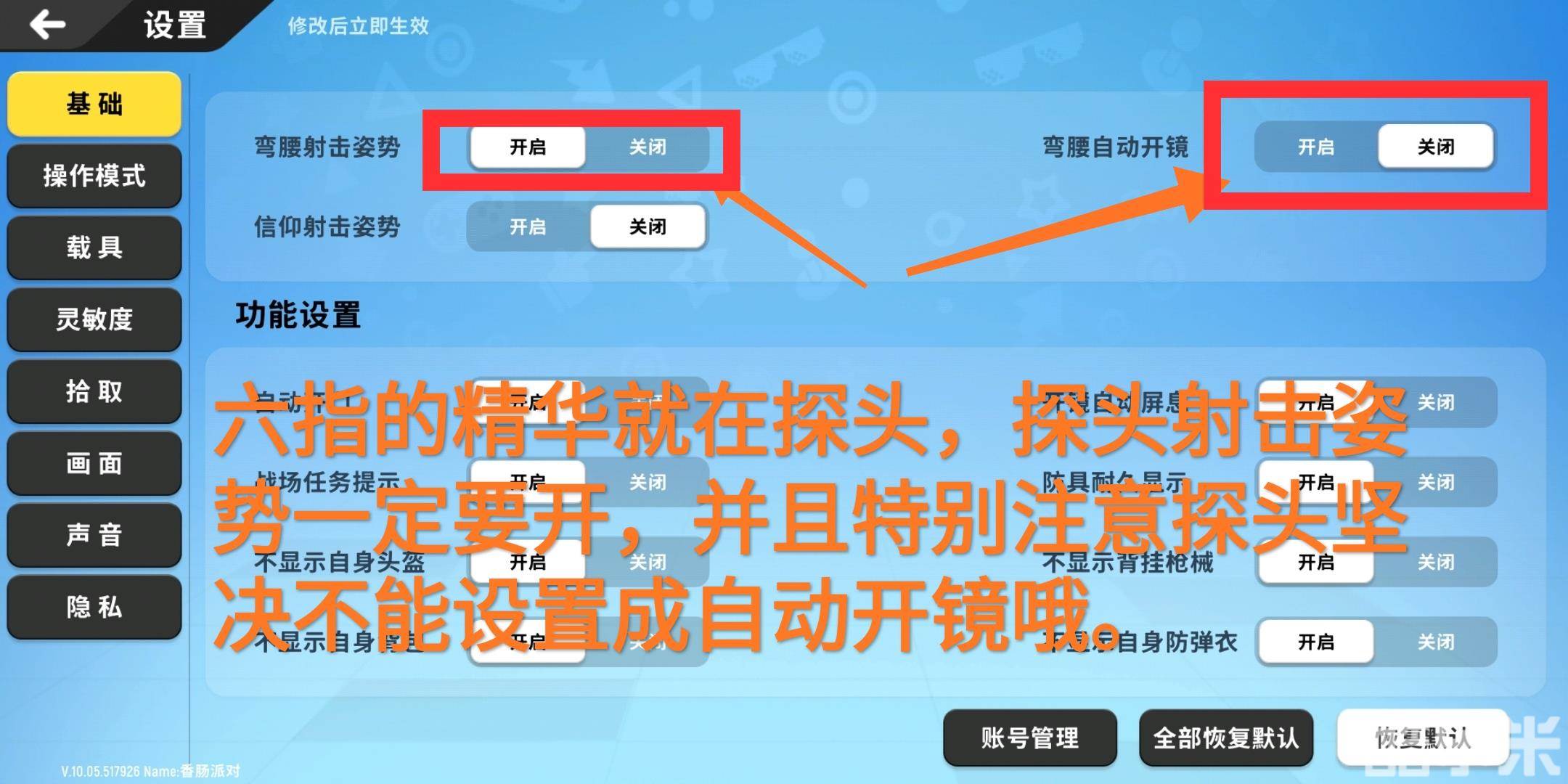 当然,六只操作会使我们两个大拇指的移动范围更小,所以建议调高灵敏度和陀螺仪,这样不仅有利于六指操作的流畅,还会有助于预瞄和预判,压枪,贴脸钢枪也能矫正。