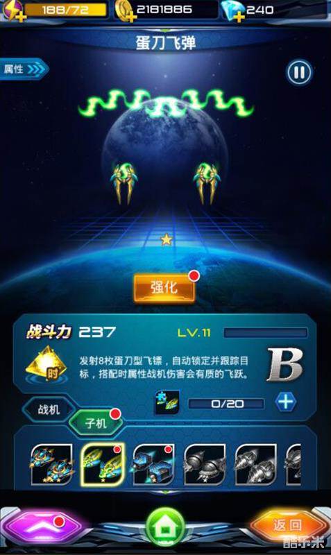 这个时候玩家可以选择提升子机来提升战队的总战力,相对于战机碎片,子机的手机速度快,战力提升速度也快,而且不同的子机在不同的战斗中更能发挥比战机本身更强的威力。下面就让我们看一下B级子机:「蛋刀飞弹」的属性吧。