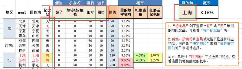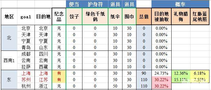 如果使用除千纸鹤之外的其他护身符或便当,是增加对应区域内所有目的地的数值(下图表1数值加到表2上),只是增加对应目的地数值,抽取目的地时还是28选一。