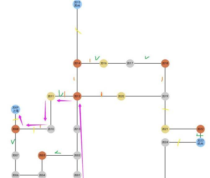 最下面中间的绿圈是出发点,线上的黄色标识是萤火虫位置,橙色是树枝照位置,绿色是婚纱照位置。紫色箭头标注的去往上海的一条合理路线,因为使用草莓汁,不受地图上萤火虫位置的影响,先经过绿色婚纱再经过橙色树枝照,最后在上海拿到腊梅蓝鸟照。