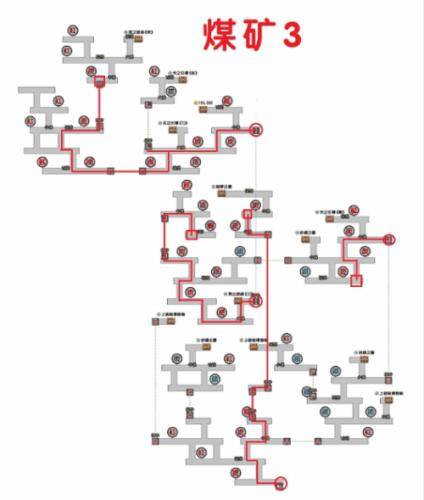 圆圈是矿车起点,方块是传送回村庄,打叉是采集的矿,因为上下移动几乎不会遇敌,所以路线省略了沿途上下移动的路线。