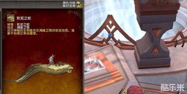 9.0版本的首个解谜坐骑名为“软泥之蛇”,这款坐骑与7.0版本的谜语人灵蛇相同模型,无非就是配色不同罢了。在坐骑栏中这款坐骑的掉落地区为《凋魂之殇》副本,描述是潜伏在凋魂之殇的软泥地底。