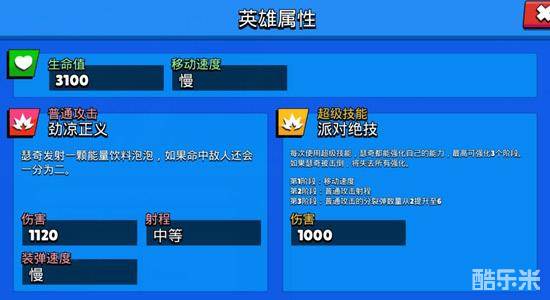 普通攻击:劲凉正义,瑟奇发射一颗能量饮料泡泡,如果命中敌人还会一分为二