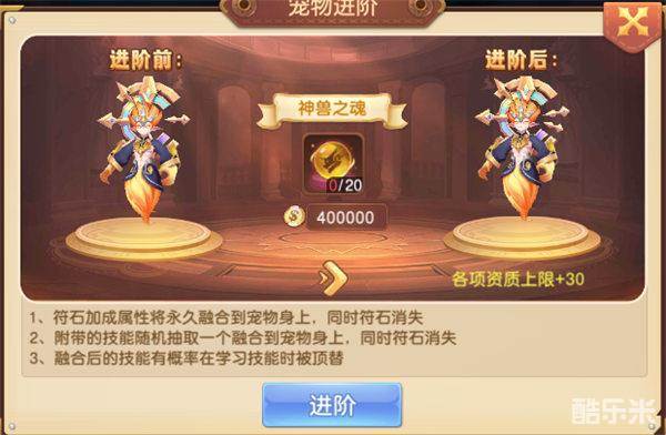 神兽相对于其他宠物而言,最大的优势就是能进阶3次。每次进阶都需要穿戴好魔核和护符才能进阶噢