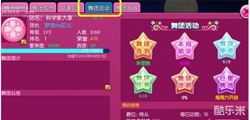 舞团使命:舞团使命是每周刷新的一个舞团共有的目标,由全体团员来完成,完成后,能获得舞团繁荣度,舞团资源以及丰富的个人奖励;