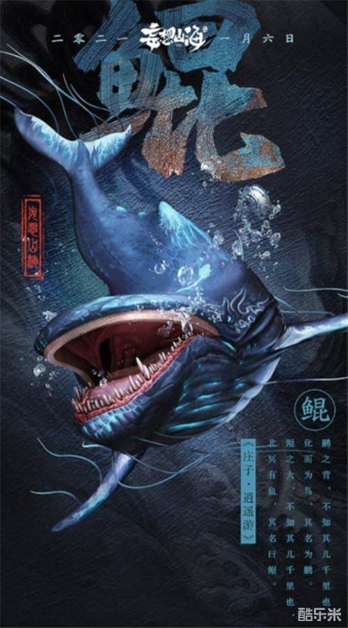 《列子·汤问》中有云:“终北之北有溟海者,天池也,有鱼焉,其广数千里,其长称焉,其名为鲲。”这是说在极北之地有个溟海,有一条特别大的鱼,这种鱼叫鲲。鲲是最有想象色彩的异兽,它神秘、强大,能上天能入海,无所不能,它本身就是强大的象征,是一代代百姓幻想的结晶。