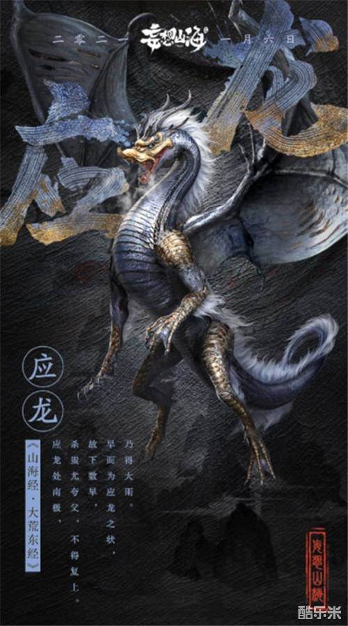 《山海经·大荒东经》有云:“大荒东北隅中,有山名曰凶犁土丘。应龙处南极,杀蚩尤与夸父,不得复上,故下数旱,旱而为应龙之状,乃得大雨”。应龙全称应时之龙、应德之龙,其名为吉,亦名庚辰,即黄龙、飞龙,是古代神话中一种有翼的创世龙神,也是中国传统中的真龙、祖龙 ,四大神龙之一。应龙居于天上世界,却数次下凡为伏羲送上河图,带女娲朝见天帝,又化身老龙,假名为吉,教导炎帝神农,当她授课之时,九天之上的所有仙、灵全都会听她传道,可说是众神之师。黄帝蚩尤大战时,为助黄帝争帝而于南极杀蚩尤、斩夸父;助大禹治水而以龙尾画地成江、开辟龙门、擒无支祁,堪称中国神话战绩第一的无双战神。