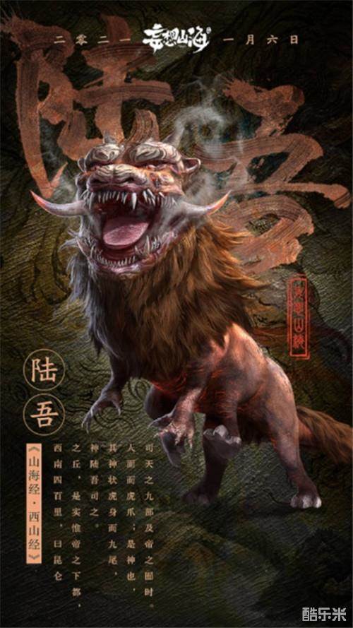 《山海经·西山经》有云:“西南四百里,曰昆仑之丘,是实惟帝之下都,神陆吾司之。其神状虎身而九尾,人面而虎爪;是神也,司天之九部及帝之囿时。”它长得十分神奇,体态怪异,它像虎长着虎尾,不仅足足有九十九只老虎那么大,还有九条虎尾!它的职责是管理天之九部和天帝园圃的时节,据说陆吾对工作可是认真谨慎,尽职尽责。