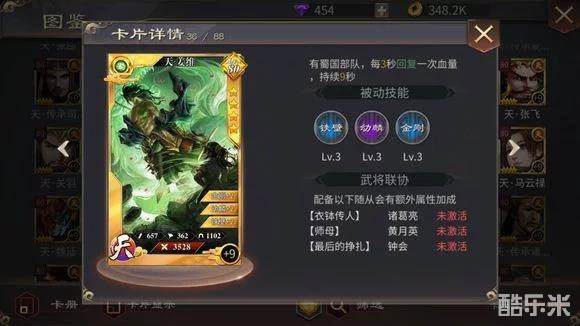 主动技能消耗士气3点,使所有蜀国部队分摊所受伤害的90%,持续20秒,在3秒之后使所有蜀国部队,每3秒回复一次血量,持续9秒;