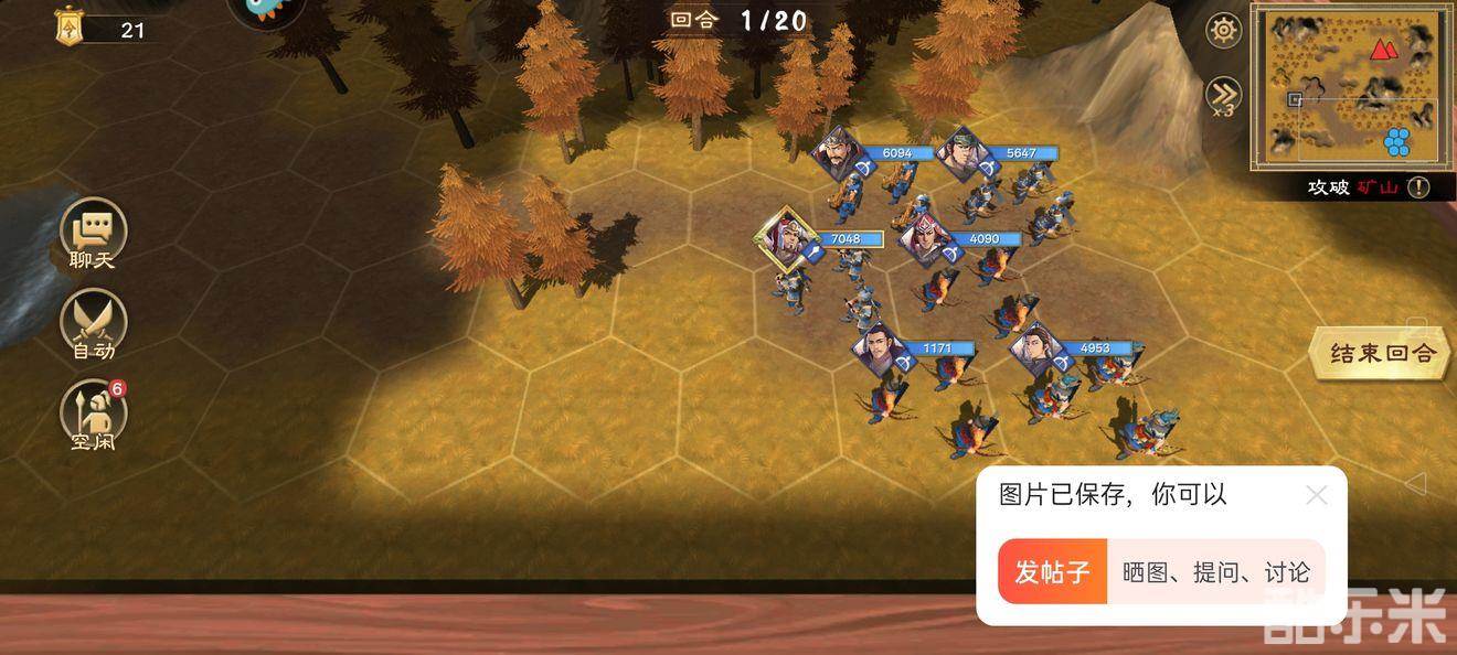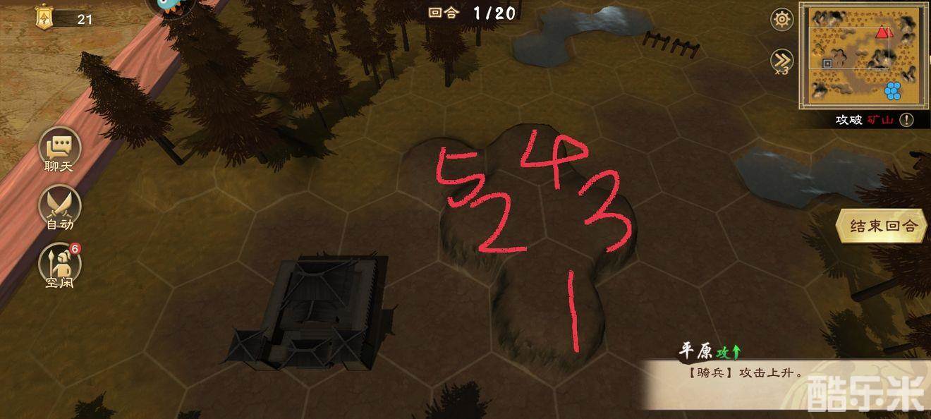 2.曹性紧跟糜芳身后,跟着糜芳节奏走,开局第一回合开奔袭,第二回合到矿4格外无限普攻。