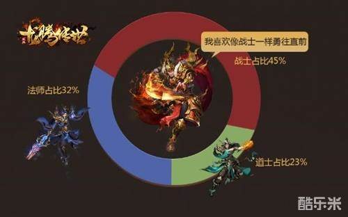 在游戏中最受欢迎的职业为战士,占到45%,而其他两个法师和道士则是32%和23%,同时男女玩家比例为9:1,但角色性别中选择女性角色的共占到了44%