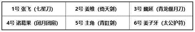 一号位的张飞无可撼动。二号位的姜维也可以帮助团队在主坦位置上挑衅敌方,控制敌方输出。诸葛果居四号位,群伤的效果搭配闭月团扇,为团队补充控制,在所不辞。主角五号与六号的姜子牙不再强调。