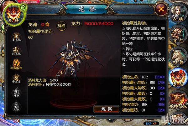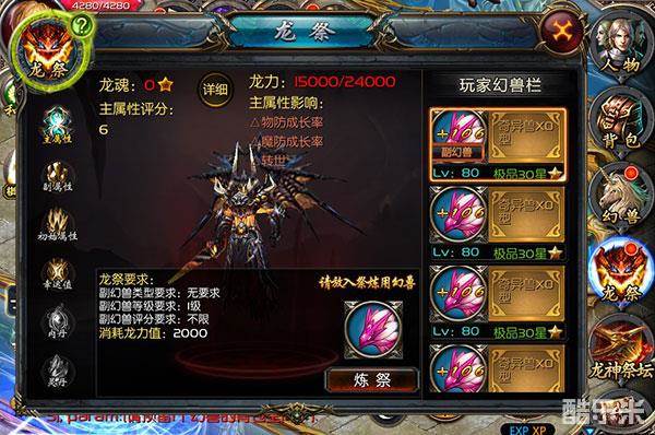 培养方式:①幻兽炼祭:将符合条件的幻兽放入炼祭框中;②宝石炼祭:龙魂幸运值达到70以上即可使用幻魔晶石或幸运药水进行炼祭。(注:以上两种炼祭方式均需消耗龙力值)