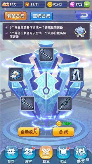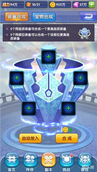 2、5个相同部位的装备可以合成出1个同样部位的装备且品质更高。游戏里装备的品质也用颜色来区分,最低从绿色开始,蓝色,紫色,橙色,红色,最高是金色。合成功能最贴心的地方就是让每个看似过时的装备都变得有用了,给每一位玩家希望。
