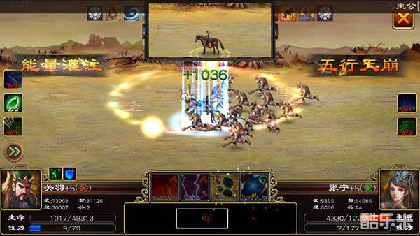 第五轮攻击后,副将杨威救了关羽一命,张宁的小兵也上去给关羽送血了。危险。所以张宁打关羽一定不要弓箭兵。