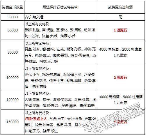 2、6个不同阶段中只能根据活动期间,累计消费金币数量所在阶段选择武将进行申请;如小明活动期间累计消费达到15W金币,则可以在列出的所有武将中选择一个武将,或者选择消费15w金币额度的澄源石(如武将和澄源石均不需要,则可以选择12w金币额度的进阶酒奖励)!