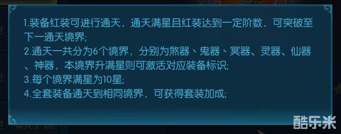 玩家到达80级可以开启通天,可以使装备进行通天,通天满星且红装到达一定阶数,可以突破至下一通天境界