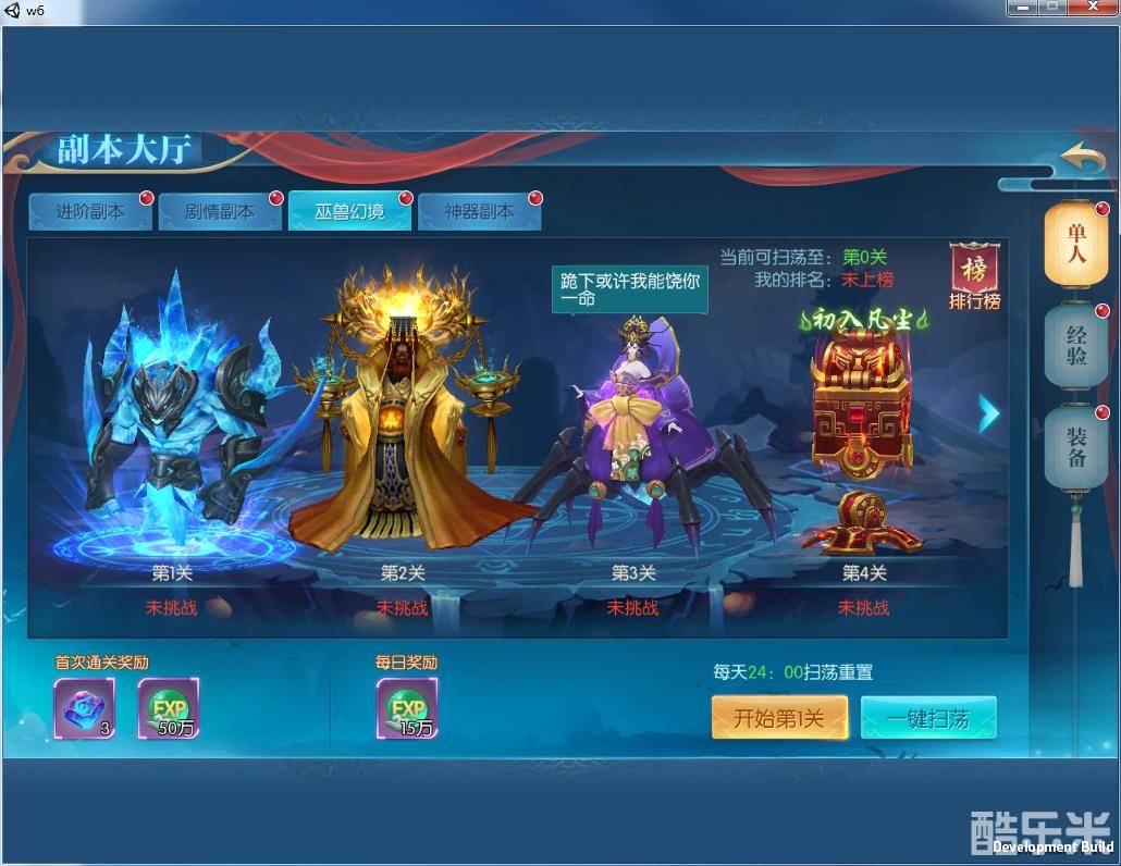 2)首次通关都有一定数量的绑元奖励或装备强化石或进阶丹之类的丰厚奖励, 玩家击杀完副本中的BOSS后就算成功,并且获得通关奖励,巫兽幻境有一键扫荡功能,可以节省玩家不少时间;